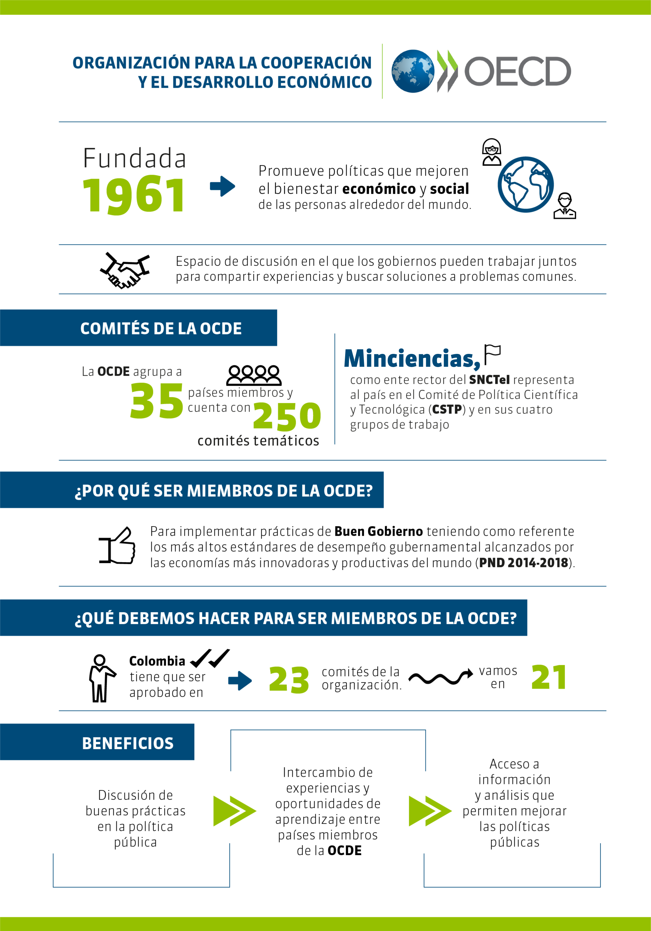 El Gobierno Nacional tomó la determinación de someter la candidatura de Colombia a la Organización para la Cooperación y el Desarrollo Económico (OCDE) con el fin desarrollar el principio del Buen Gobierno en referencia a los más altos estándares de desempeño gubernamental alcanzados por las economías más innovadoras y productivas del mundo (PND 2014-2018). En el sector de Ciencia, Tecnología e Innovación, Minciencias tiene la responsabilidad de representar los intereses nacionales y garantizar el cumplimiento de los compromisos adquiridos con dicha organización, en busca del fortalecimiento de las políticas públicas de CTeI y un mejor desempeño del Sistema Nacional.