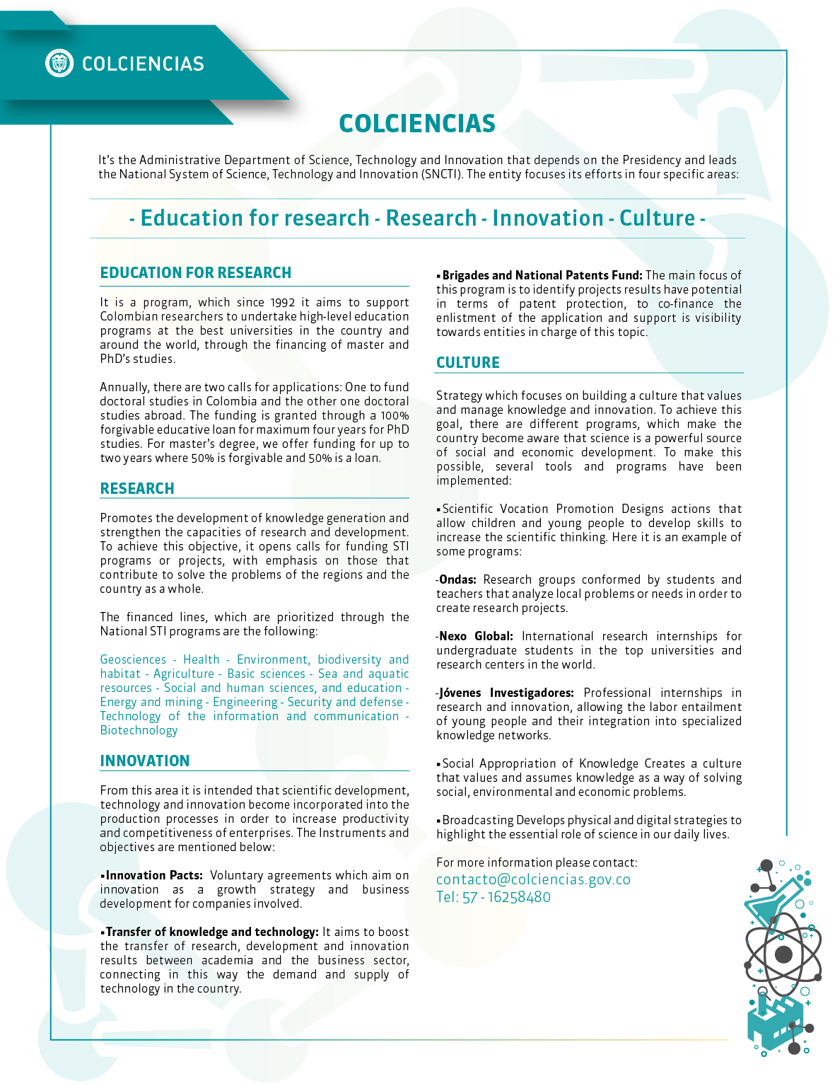 It promotes the policies to foster CT+I in Colombia. Activities inherent in the fulfillment of its mission involves agreements in promotion policies aimed at the production of knowledge, the construction of CT+I capacities, and the facilitation of the circulation and uses of such capacities and knowledge for the integral development of the country, and the welfare of Colombian people.