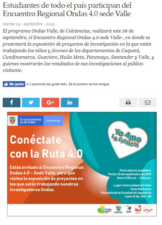 Inicio » Sala de prensa » Cali Buenas Noticias: Estudiantes de todo el país participan del Encuentro Regional Ondas 4.0 sede Valle Cali Buenas Noticias: Estudiantes de todo el país participan del Encuentro Regional Ondas 4.0 sede Valle
