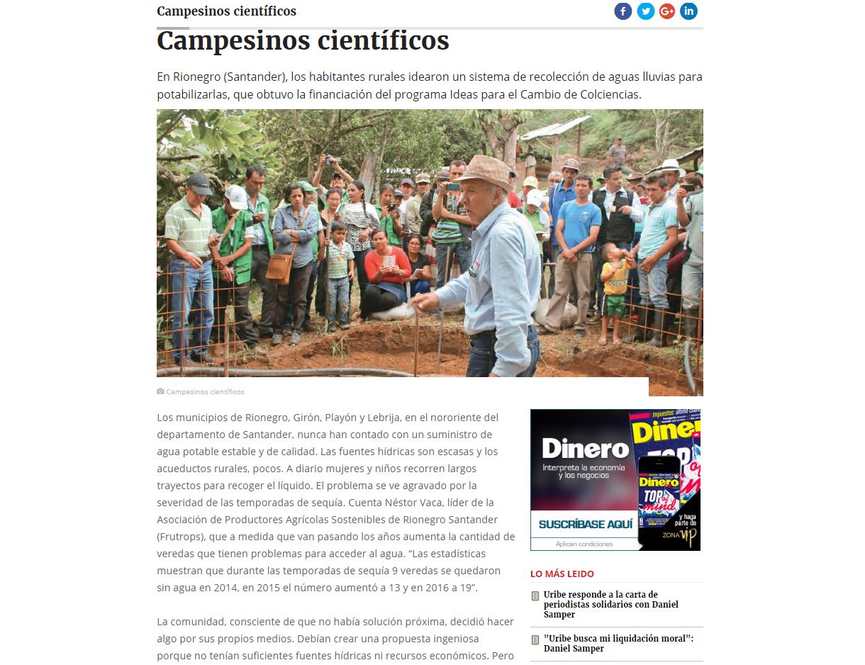 En Rionegro (Santander), los habitantes rurales idearon un sistema de recolección de aguas lluvias para potabilizarlas, que obtuvo la financiación del programa Ideas para el Cambio de Colciencias.