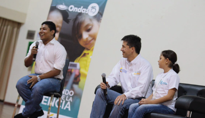 Durante el evento de cierre se llevó a cabo el conversatorio “El poder de la ciencia para transformar realidades”, liderado por el doctor Óscar Gualdrón, director de Fomento a la Investigación de Colciencias, y en el que participaron Magdalena Cardona Cortes, niña Ondas de Manizales; Luis Eduardo Peláez Jaramillo, ex Ondas Antioquia, y nuestro anfitrión Jhon Jerley Torres, quienes hablaron sobre cómo la investigación cambió su forma de ver el mundo y su futuro. Ellos comparten una historia, la de ser o haber sido parte del Programa Ondas.