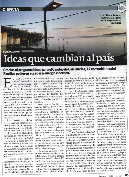 Gracias al programa Ideas para el Cambio de Colciencias, 14 comunidades del Pacífico pudieron acceder a energía eléctrica.
